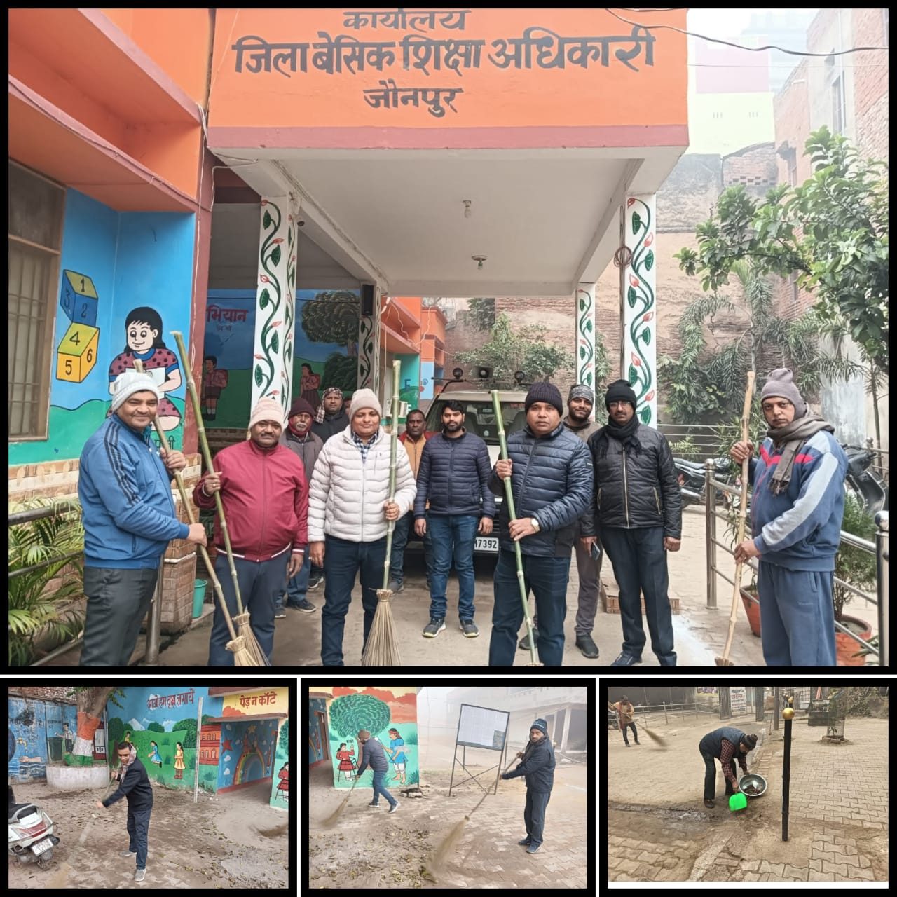 जौनपुर, 14 जनवरी, 2024:-कार्यालय जिला बेसिक शिक्षा अधिकारी जौनपुर के परिसर एवं कार्यालय कक्ष में जिला बेसिक शिक्षा अधिकारी डॉक्टर गोरखनाथ पटेल के नेतृत्व में धूमधाम से स्वच्छता अभियान की शुरुआत आज दिनांक 14 जनवरी 2024 को की गई। जिला बेसिक शिक्षा अधिकारी द्वारा अग्रणी भूमिका निभाते हुए स्वयं कार्यालय परिसर में स्वयं झाड़ू लगाते हुए साफ सफाई की गई। जिला बेसिक शिक्षा अधिकारी डा0 गोरखनाथ पटेल द्वारा वार्ता के क्रम में बताया गया कि आगामी 22 जनवरी को अयोध्या में श्री राम जन्मभूमि में बना रहे मंदिर में प्रभु श्री राम की प्राण प्रतिष्ठा होगी। तदोपरांत दिनांक 24 जनवरी को संपूर्ण प्रदेश में उत्तर प्रदेश दिवस मनाया जाएगा एवं 26 जनवरी को गणतंत्र दिवस का राष्ट्रीय पर्व मनाया जाएगा। उक्त के दृष्टिगत उत्तर प्रदेश बेसिक शिक्षा परिषद प्रयागराज द्वारा संचालित बेसिक शिक्षा विभाग जनपद जौनपुर में संचालित समस्त विद्यालयों के अंदर कक्षा कक्ष में, परिसर एवं उसके आसपास के किसी प्रकार की गंदगी या प्लास्टिक आदि की पूरी तरह से साफ सफाई विद्यालय में कार्यरत कर्मचारियों द्वारा की गई है। दिनांक 22 जनवरी से 26 जनवरी के बीच सभी विद्यालयों भवनों को प्रकाशित किया जाएगा। कार्यालय जिला बेसिक शिक्षा अधिकारी परिसर एवं कक्षा कक्षों की सफाई में जिला बेसिक शिक्षा अधिकारी के नेतृत्व में कार्यालय के प्रधान सहायक श्री रमेश चंद्र वर्मा, वरिष्ठ सहायक श्री विंध्यवासिनी उपाध्याय, श्री विजय बहादुर शर्मा के साथ-साथ सहायक वित्त एवं लेखा अधिकारी बेसिक शिक्षा ,समस्त जिला समन्वय, एवं वित्त एवं लेखा अधिकारी बेसिक शिक्षा कार्यालय जौनपुर के समस्त कर्मचारियों द्वारा श्रमदान करते हुए साफ सफाई की गई।