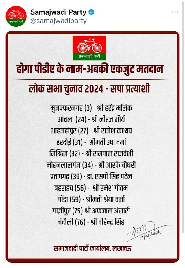 लखनऊ । सपा ने लोकसभा प्रत्याशियो की एक और लिस्ट जारी की ।
